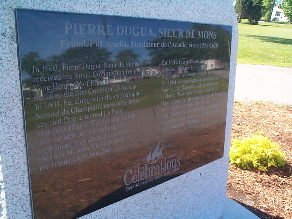 On the 400th anniversary of the passage of the Dugua expedition past the site where Saint John would be established, a monument was constructed in this largely English-speaking city to remember Dugua. Although Champlain had named the St John River (after John the Baptist) in 1604, on this occasion English-speakers joined with Acadians to credit the much-ignored leader of the expedition.