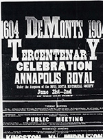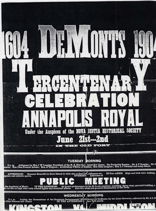1904 marked the tercentenary of the arrival of the Dugua expedition that resulted in the establishment of the settlement on Île Ste-Croix. Even though Port-Royal was not established until 1605, commemorative events were staged by the English-speakers at Annapolis Royal (near that site of memory).